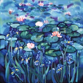 "Drawing and painting is something that I have always done. It was a natural progression to continue through to Art College. I have always been encouraged by friends and family. As a girl growing up in the States I have memories of visiting family friends in their new home. One room was lit by a vast skylight in the ceiling and was used as an artist's studio. An unfinished copy of an oil painting by Renoir stood upright on an easel. I remember feeling captivated on seeing it for the first time. I feel influenced by the impressionists, particularly Monet and Degas. I have an affinity for natural, balanced and colourful subjects. Contrast, light and repetition also have an important role. Painting on silk is the ideal medium for the work that I produce at present and in many ways acted as a catalyst for my own development as a painter. When I first had paintings accepted by the Watergate Street Gallery in Chester I did feel that this was a measure of success. To be frank I feel that I have not yet produced my best work although I believe that I am moving nearer to attaining it. Running a business has been difficult. Time is a major frustration. The previous three years have been a learning curve; and I feel that I am reaching a balance between business, family and my own work. I enjoy the challenge. After 15 years, Anglesey has become home for me. My family and friends live on the island. I grew up in California, and I have lived in the North of England, but here is where I am happiest. Ynys Môn is a beautiful island and is very individual, i.e. it does not conform to a person's usual expectations. One has the freedom to pursue one's own interests with the minimum of outside influence." |